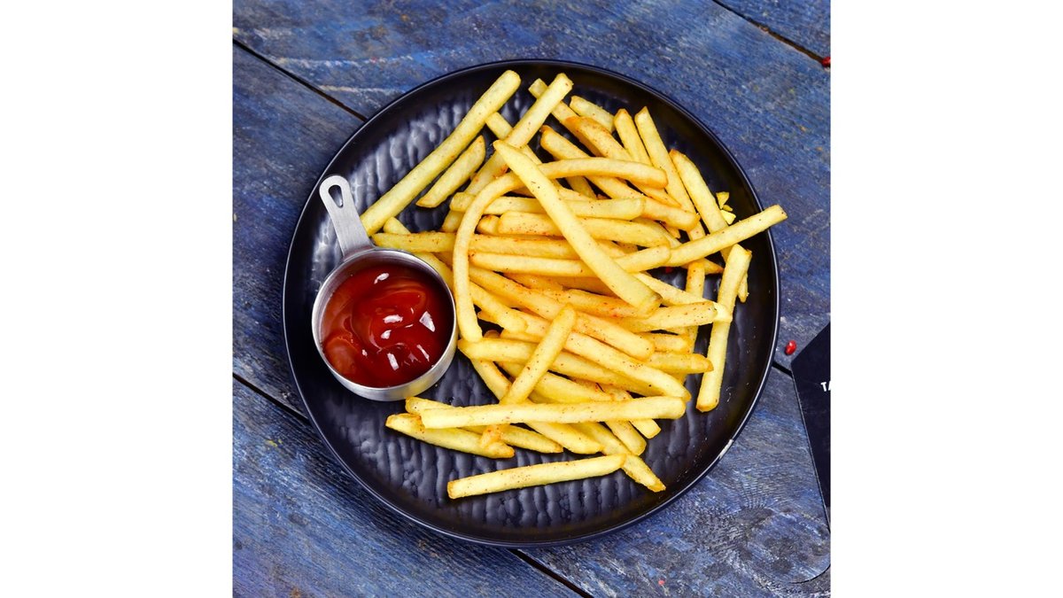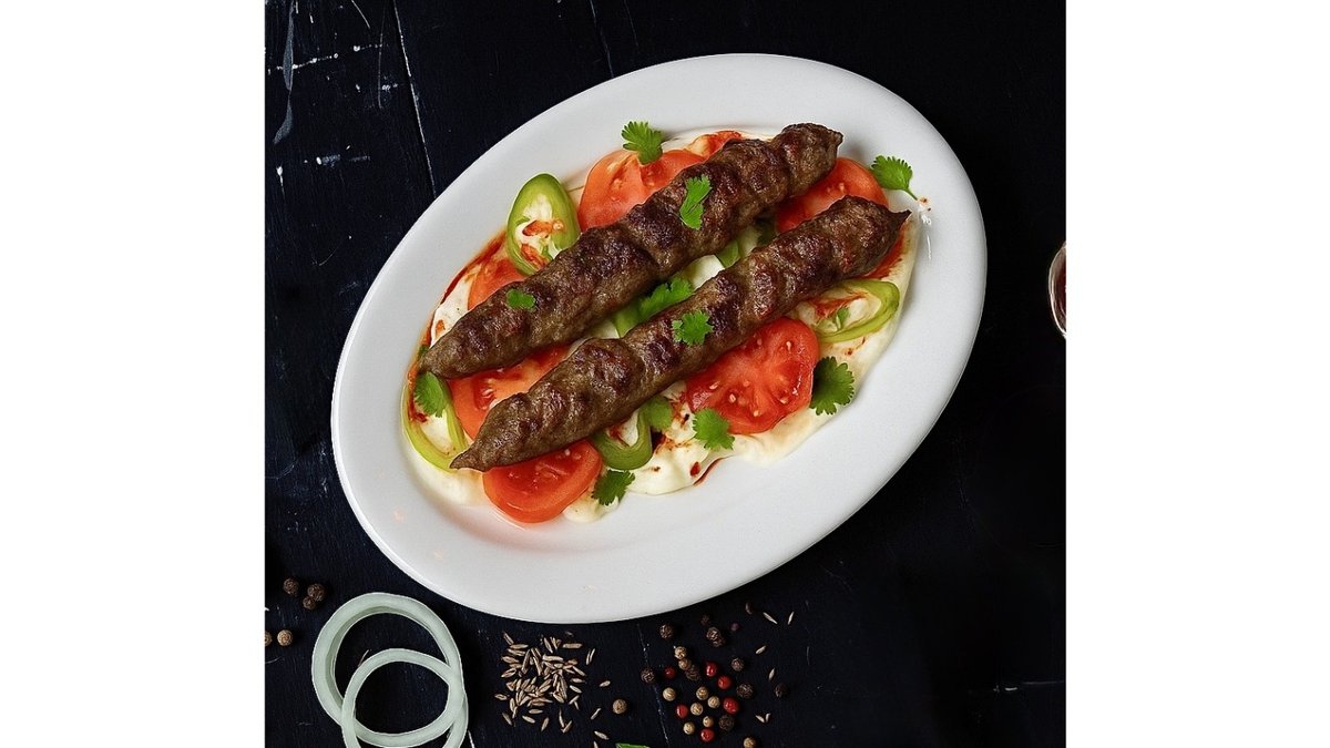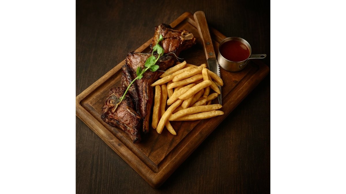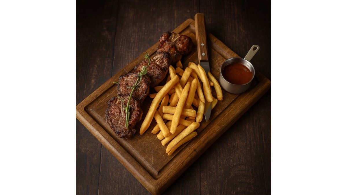 Lamb back, spices.) (Sauce: shashlik.) (Side dish: fries.)