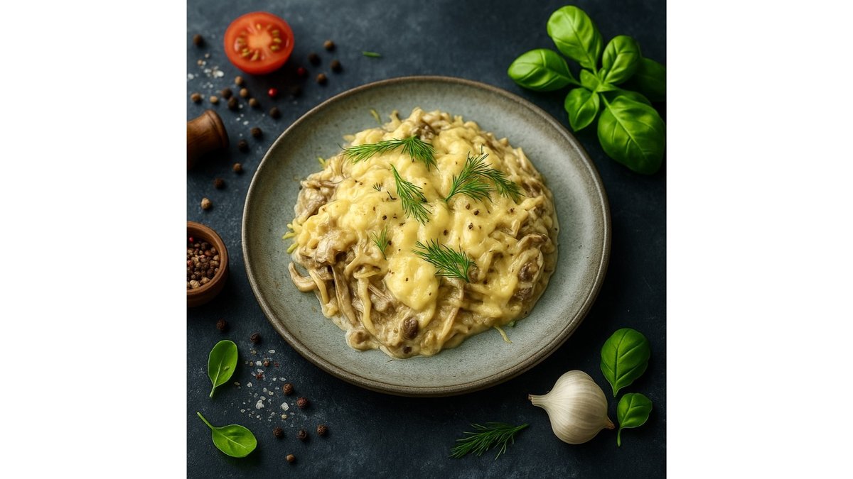 Potatoes, eggs, garlic, dill, onions, mushrooms, cream, salt, pepper, Vegeta.