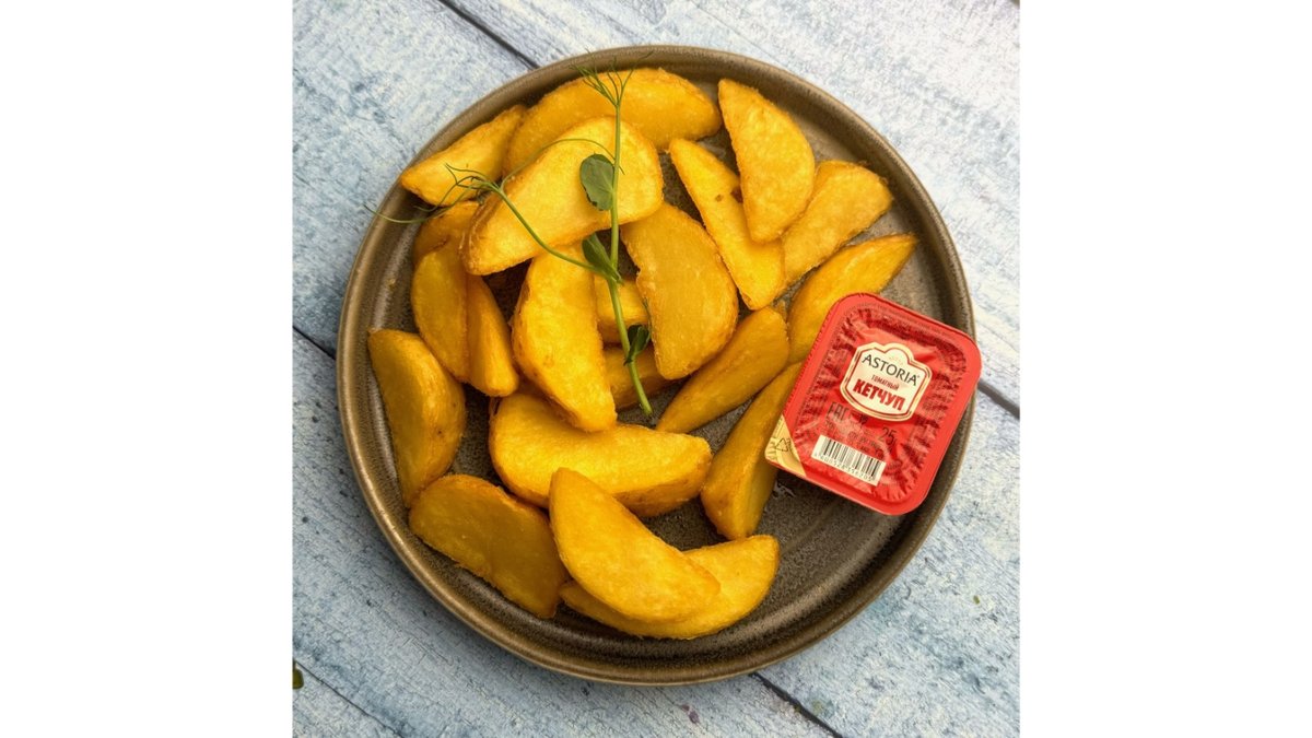 Potato wedges, smoked beef, hunting sausages, mixed salad of arugula and spinach, egg. 300 g + 20 g (BBQ sauce)