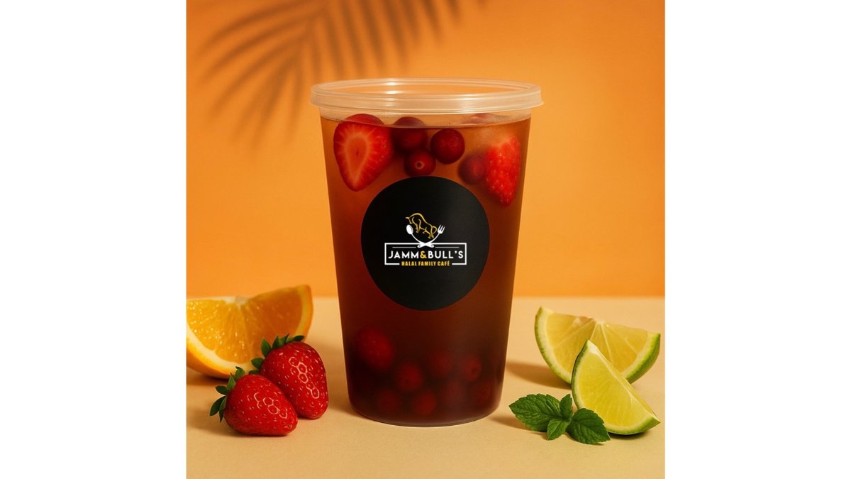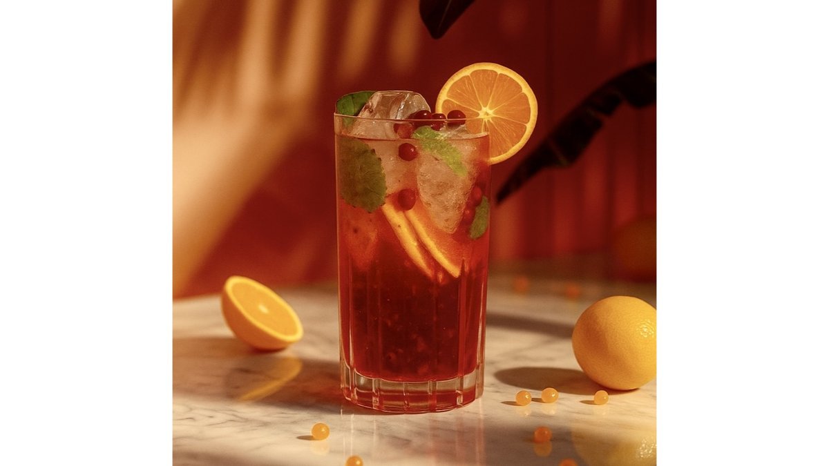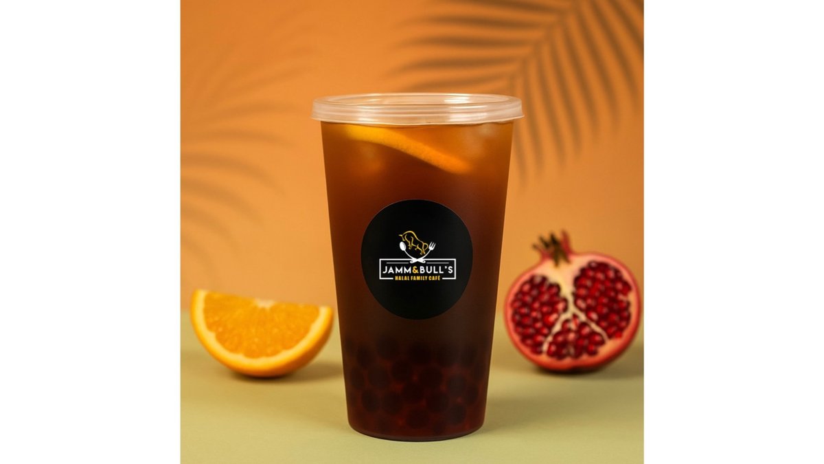 Juice balls, pomegranate syrup, orange syrup, orange, black iced tea.
