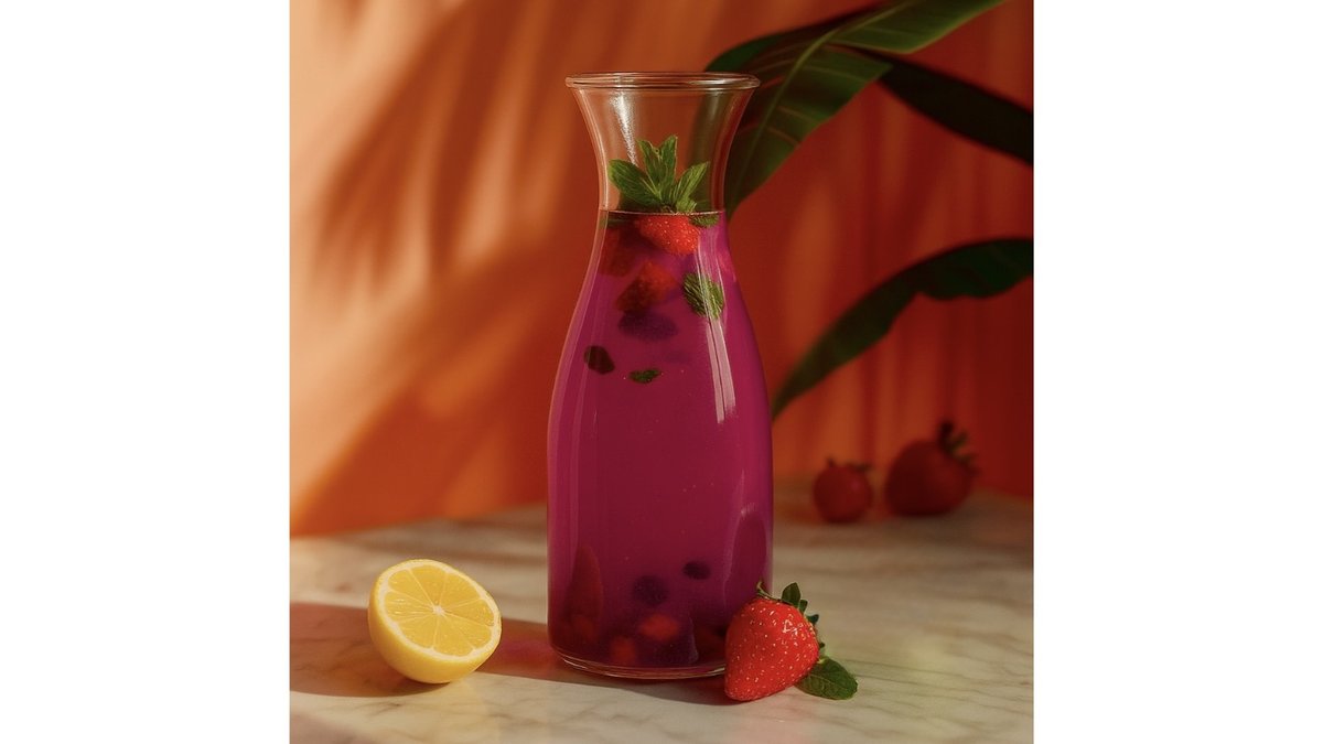 Soda, lavender syrup, strawberry syrup, mint, and raspberry.