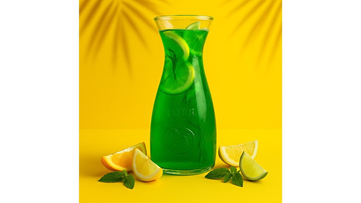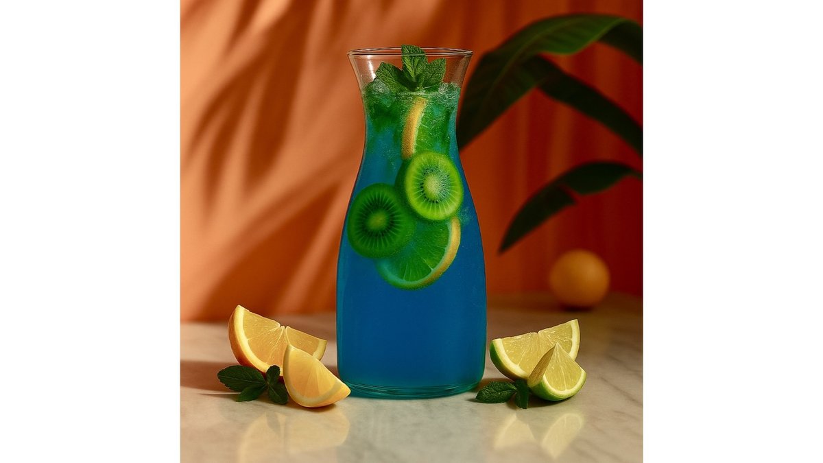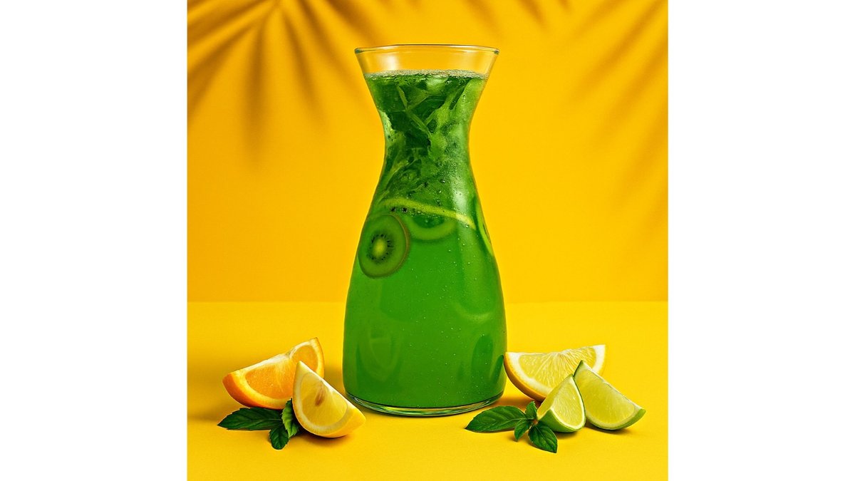 Soda, orange syrup, lime syrup, kiwi syrup, kiwi, orange, mint.