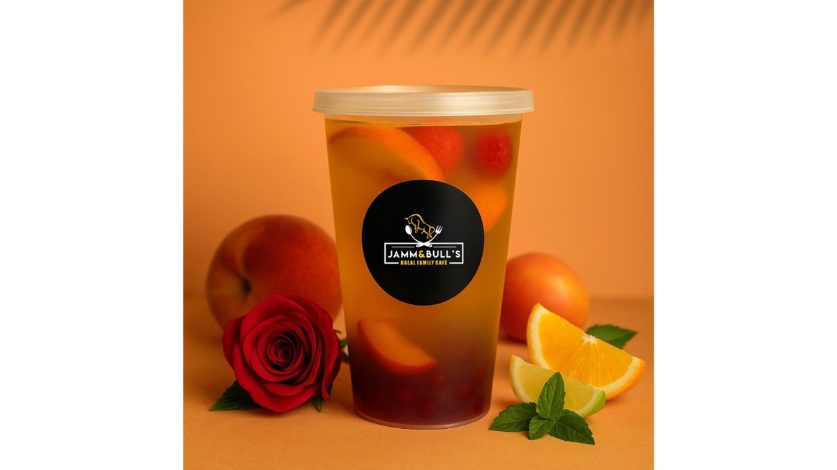 Juice balls, peach, strawberry, rose syrup, peach syrup, black iced tea.