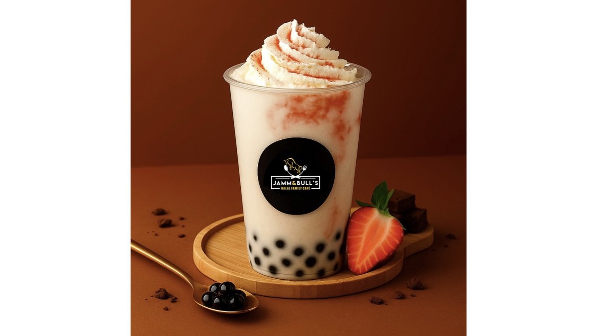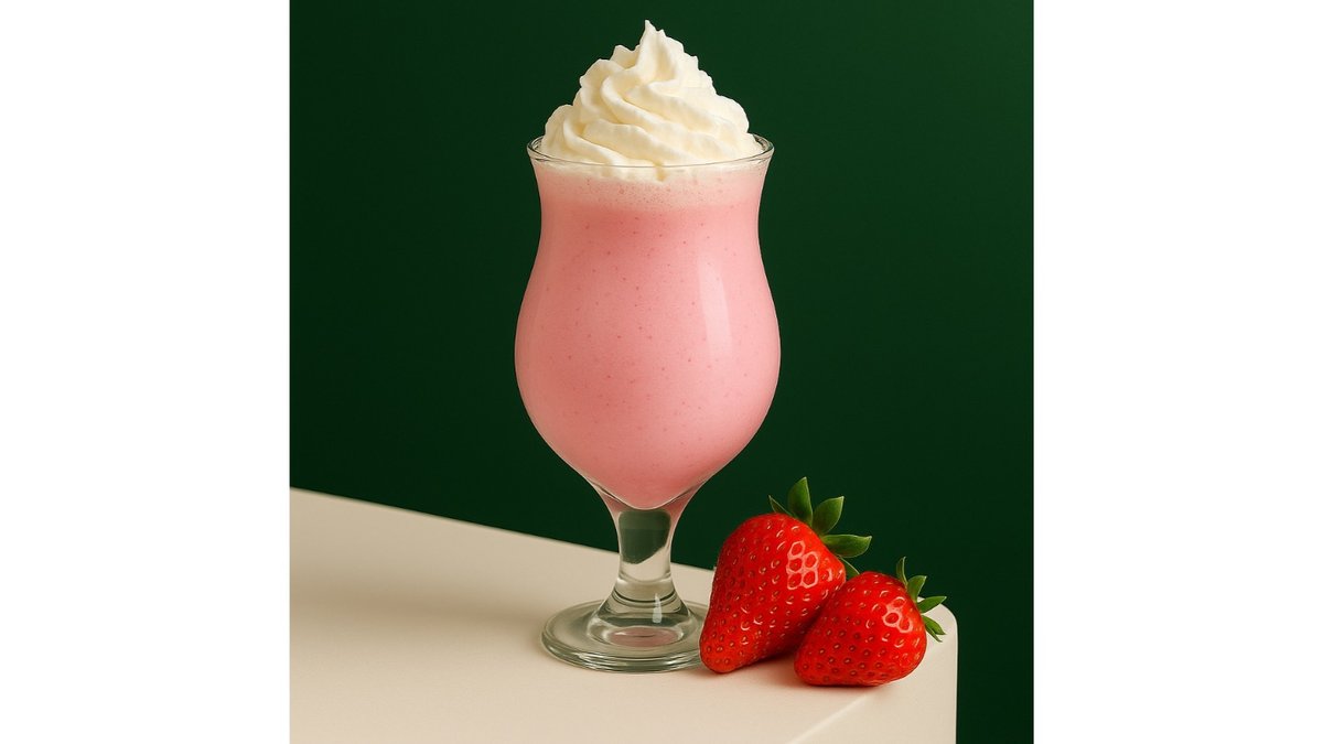 Strawberry syrup, premium 3.2% milk, ice cream, juice balls, cookie pieces, strawberries, whipped cream.
