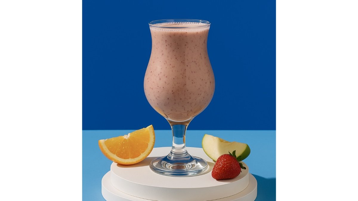 Apple, orange, strawberry, apple syrup, strawberry syrup, orange syrup, milk.