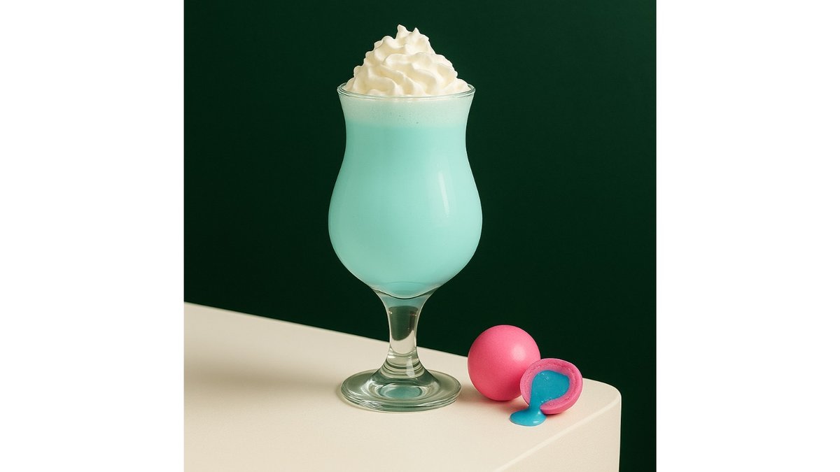 Milk, ice cream, bubble gum syrup, whipped cream.