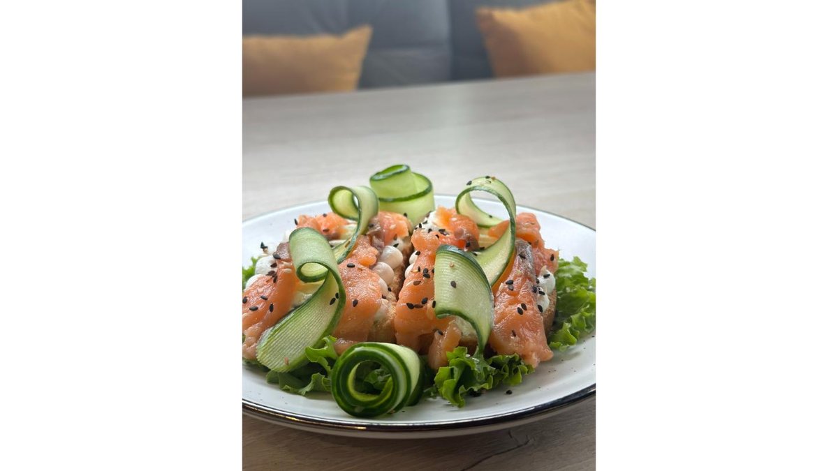 Круассан, огурец, семга, лист салата, творожный крем