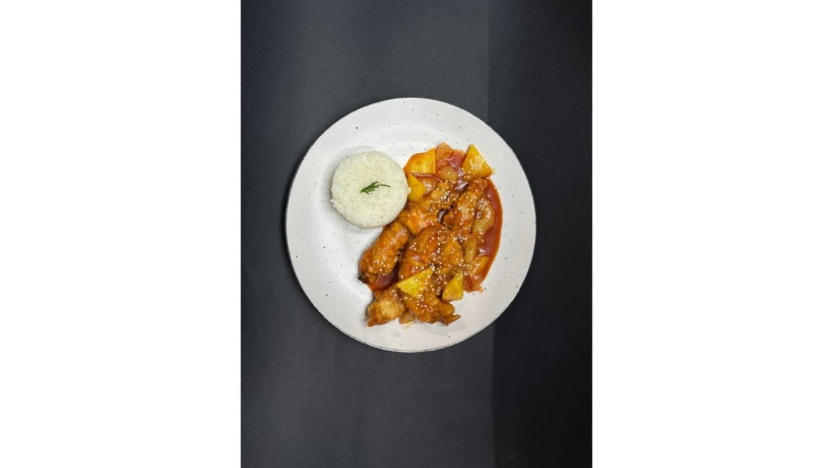 Баклажан, помидоры, болгарский перец, сыр фета, кинза, кисло-сладкий соус