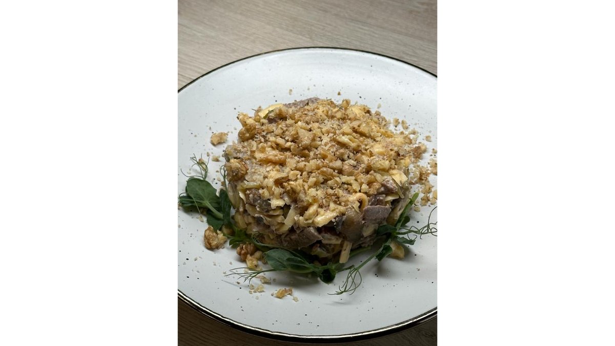 Говядина, шампиньоны, грецкий орех, сыр, майонез