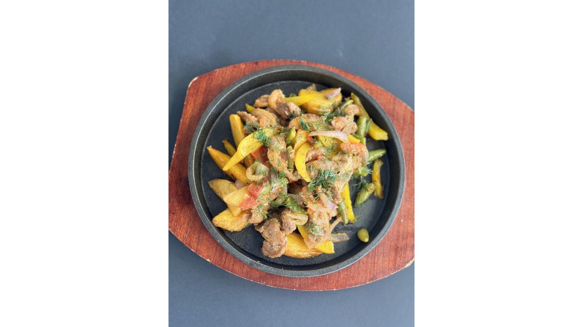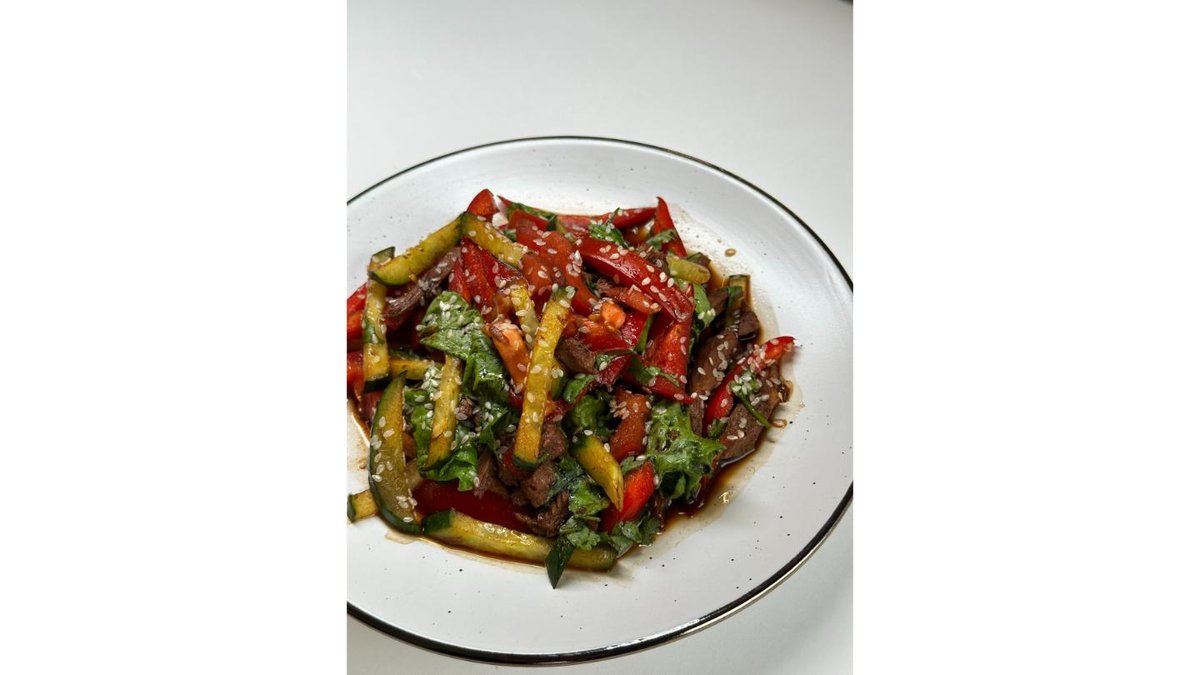 Говядина, болгарский перец, помидор, огурец, кинза, соя, масло,чеснок