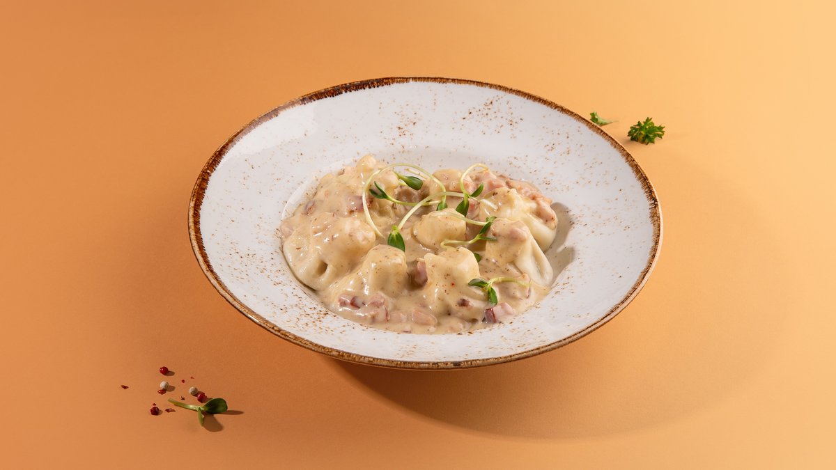 Maži chinkali su jautiena ir kiauliena rūkyto sūrio ir šoninės padaže, 8 vnt