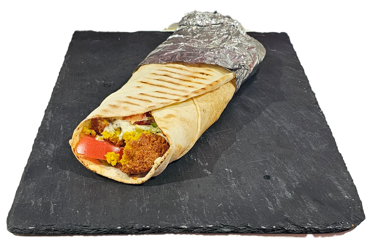 Vegetariškas patiekalas. Dydis kaip mažo kebabo lavaše. Pekino kopūstas, Iceberg salotos, agurkai, marinuoti agurkėliai, pomidorai, falafeliai ir padažas