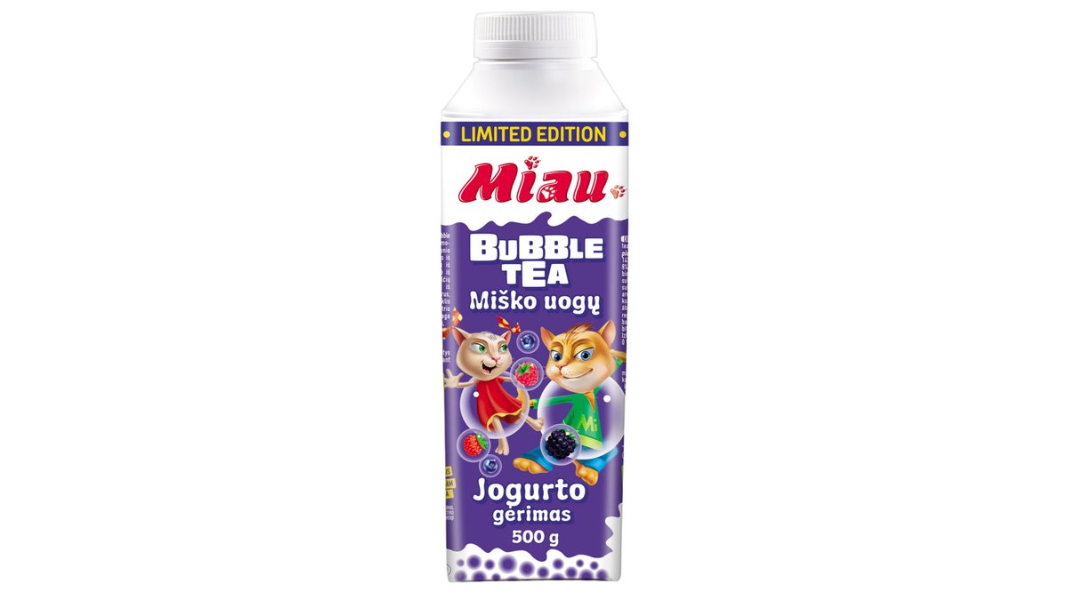 Jogurto gėrimas MIAU su miško uogomis ir Bubble tea burbuliukais, 1,3 % rieb., 500 g