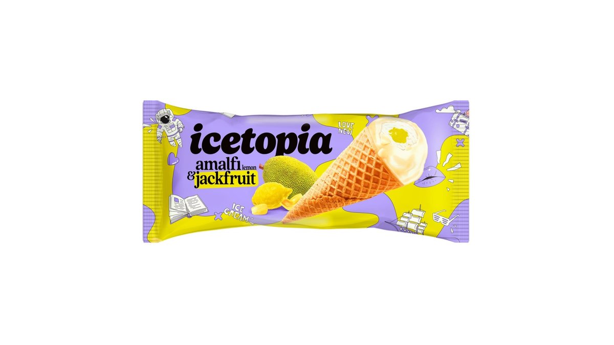 ❄️ Glaistyti grietininiai ledai su duonmedžių vaisių ir citrinų įdaru vafliniame ragelyje ICETOPIA, 150 ml / 105 g