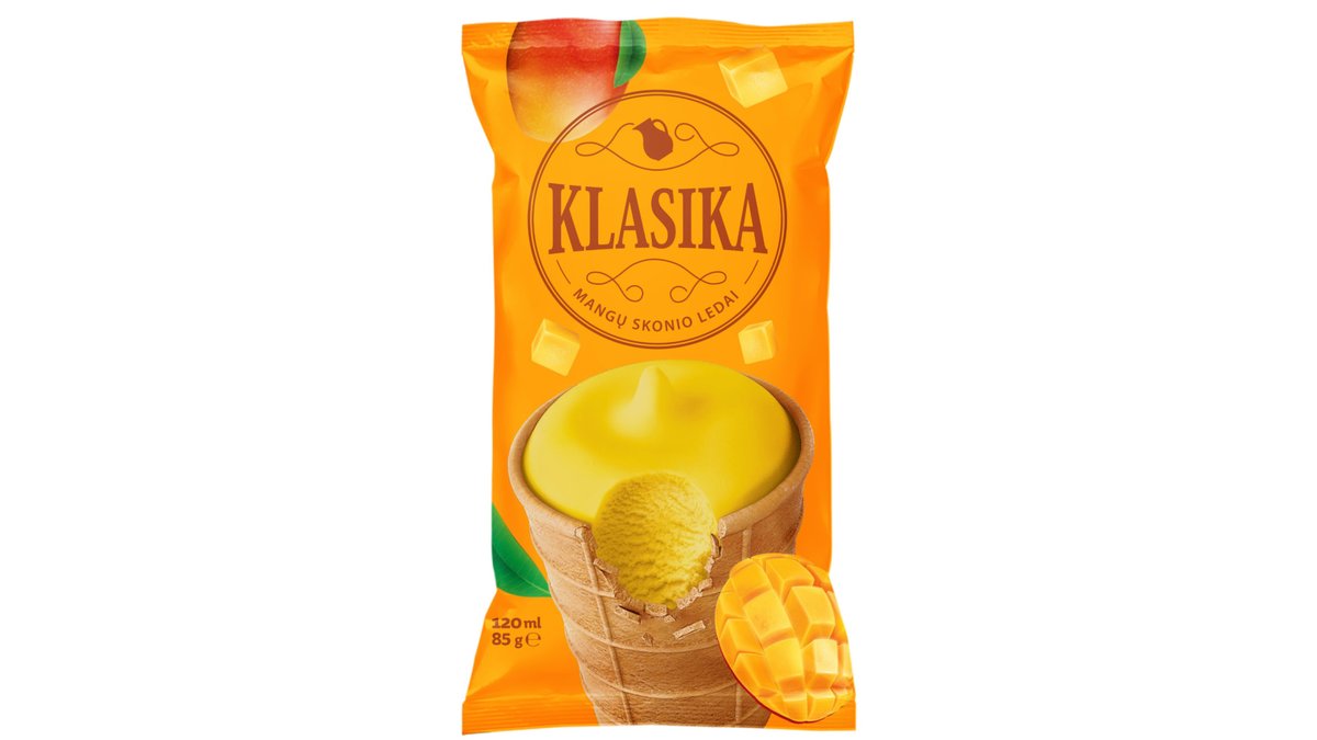 ❄️ Grietininiai valgomieji ledai NYKŠTUKAS su pasifloromis ir mangų glaistu vafliniame ragelyje, 150 ml / 93 g