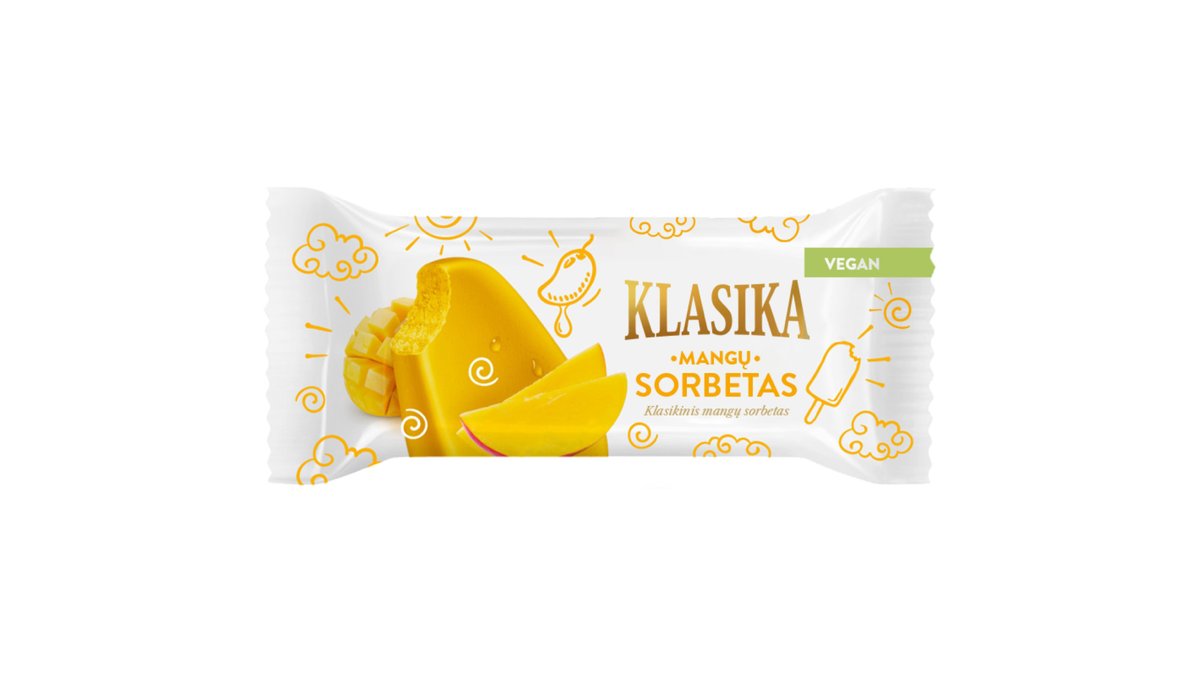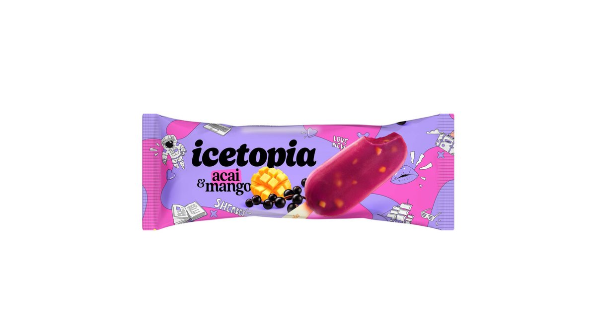 ❄️ Acai uogų ir pasiflorų vaisių šerbetas su mangų gabaliukais ICETOPIA, ant pagaliuko, 80 ml / 70 g