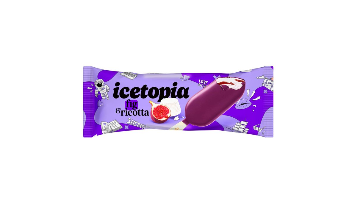 ❄️ Rikotos sūrio skonio pieniški valgomieji ledai su figų įdaru, glaistyti figų skonio glaistu ICETOPIA, 100 ml / 63 g