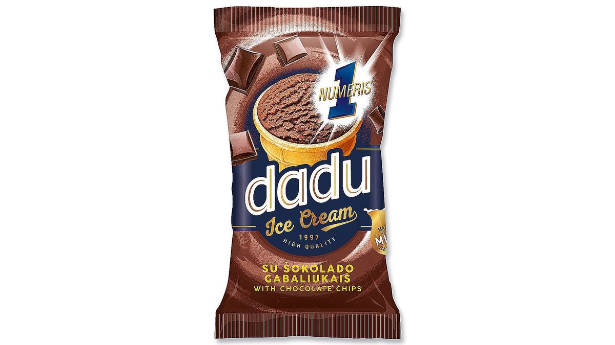 ❄️ Šokoladiniai valgomieji ledai su vafliniu traškiu įdaru, glaistyti kakaviniu glaistu, vafliniame ragelyje BALTIJA, 140 ml