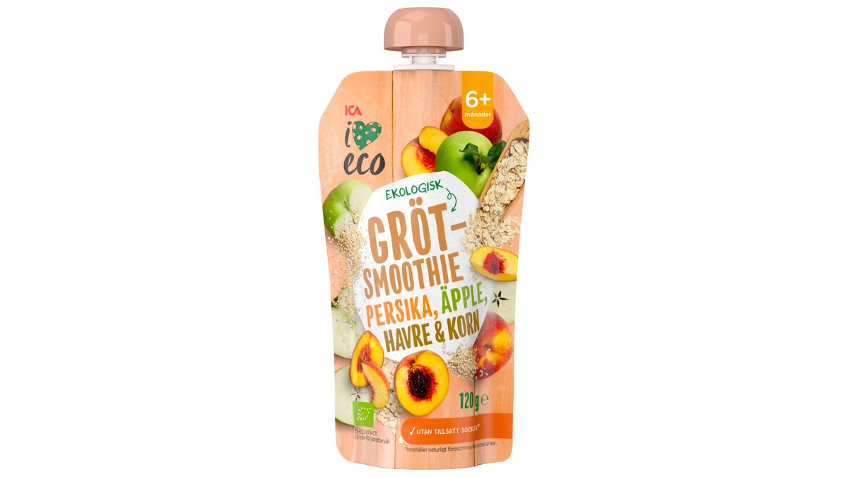 Ekologiška vaisių ir grūdų tyrelė su persikais, obuoliais, avižomis ir miežiais I LOVE ECO, nuo 6 mėn., 120 g