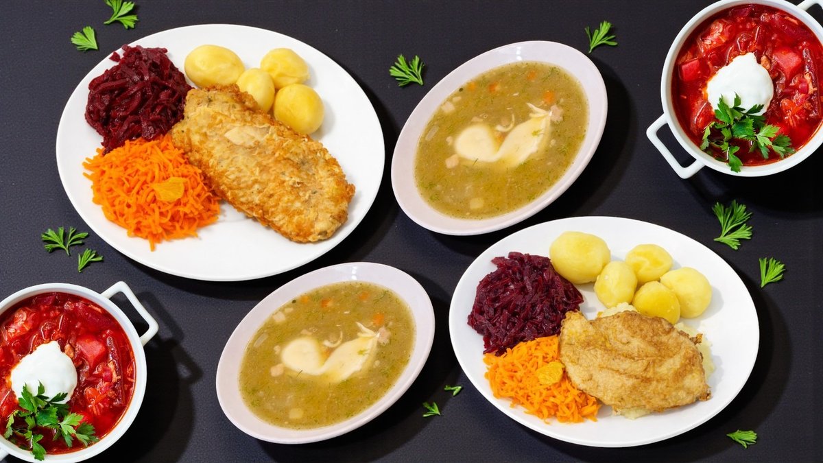 Traditional dishes, lithuanian dishes, salad, beef, soup