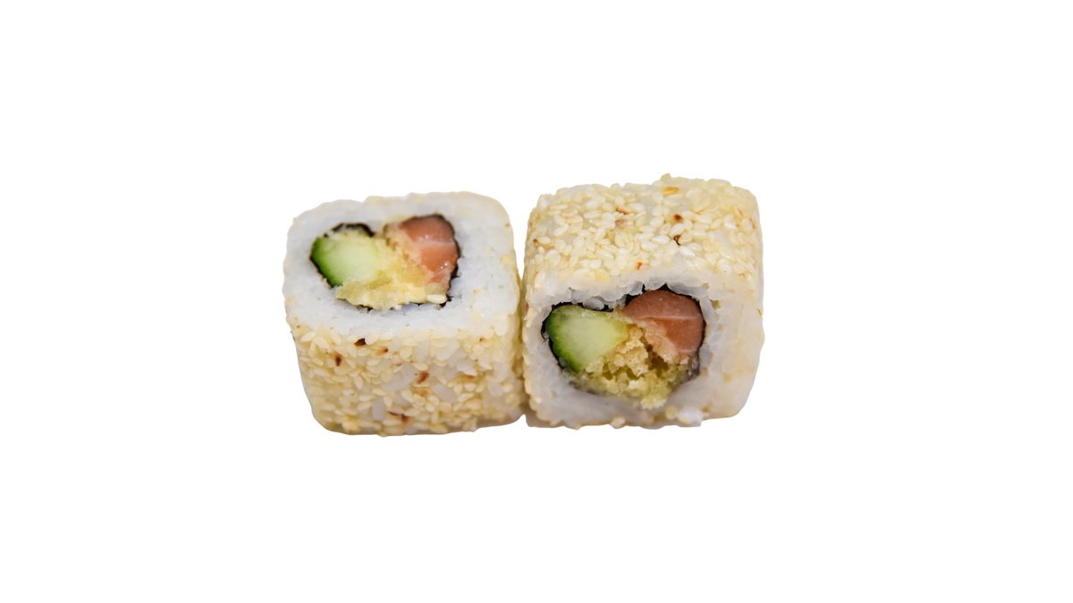 Lašiša, agurkas, majonezas, tempura traškučiai, sezamas