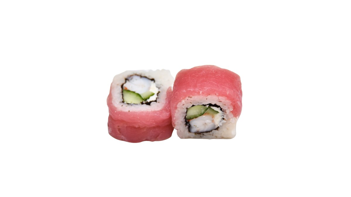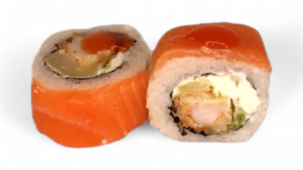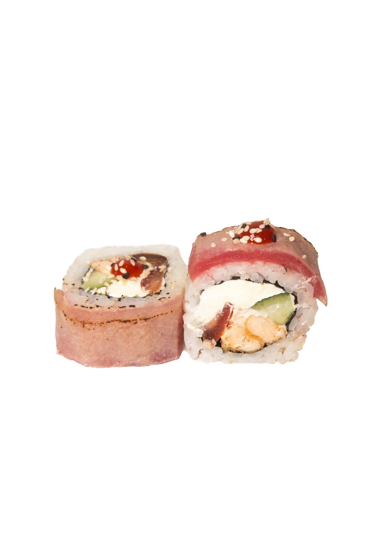 Lašiša, konservuotas tunas, avokadas, pomidoras, kremas, teriyaki padažas