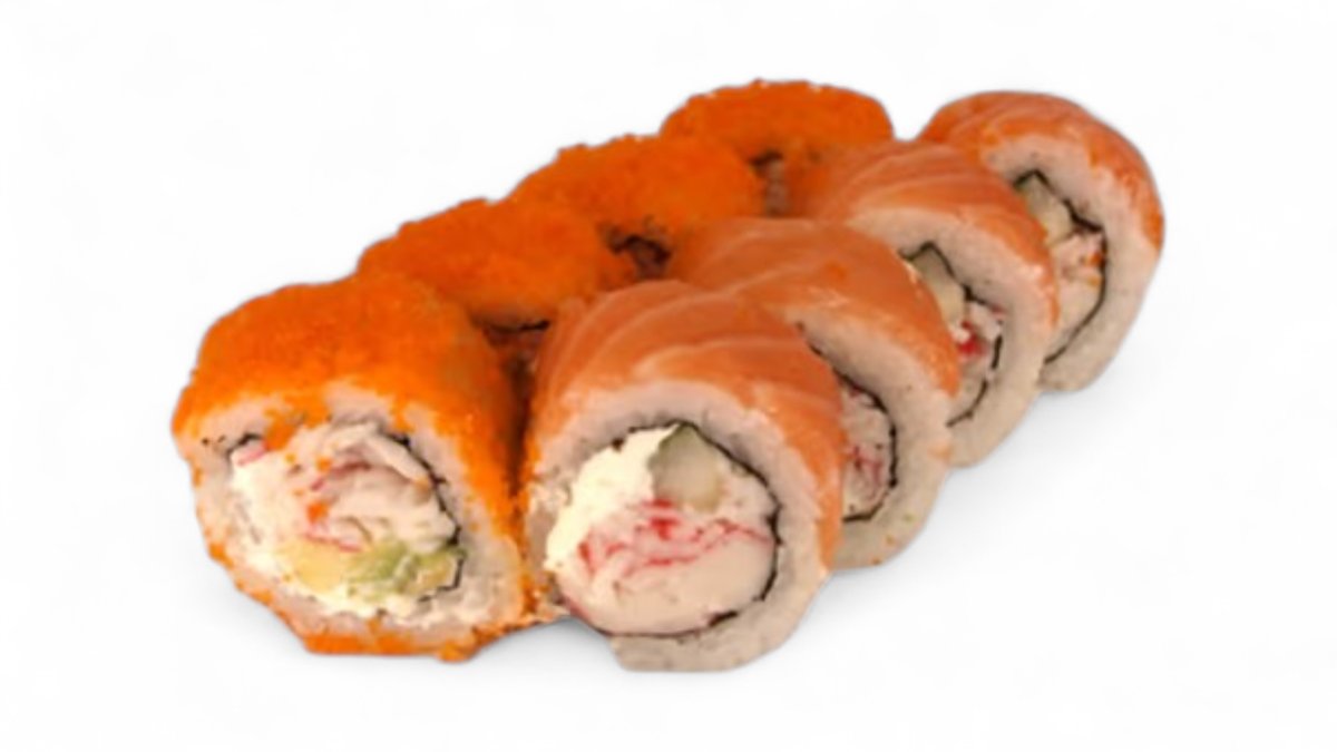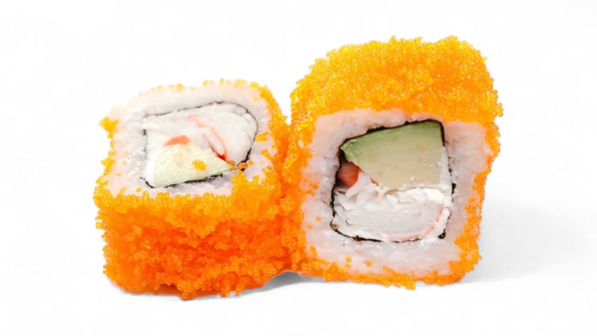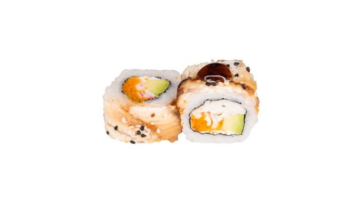 Ungurys, krabų lazdelės, oranžiniai ikrai, avokadas, kremas, teriyaki padažas