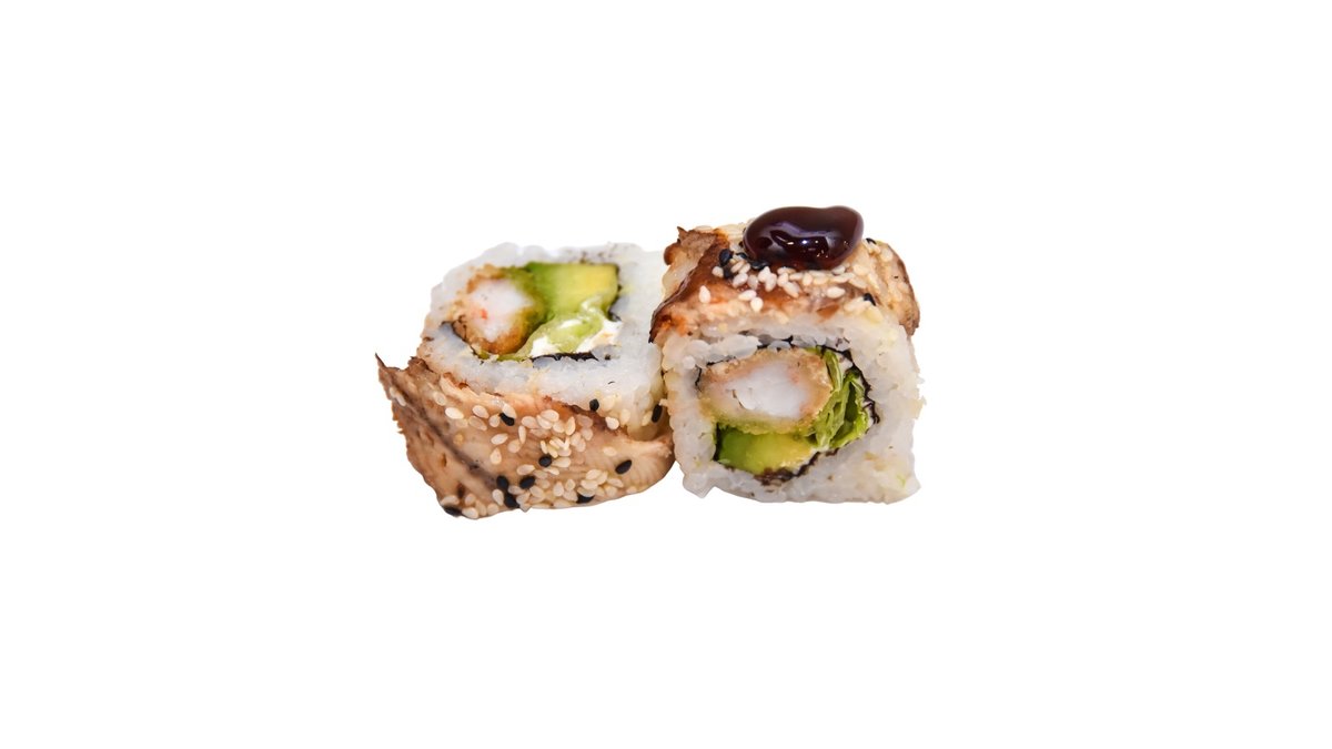 Kepta tigrinė krevetė, ungurys, avokadas, salota, kremas, teriyaki padažas