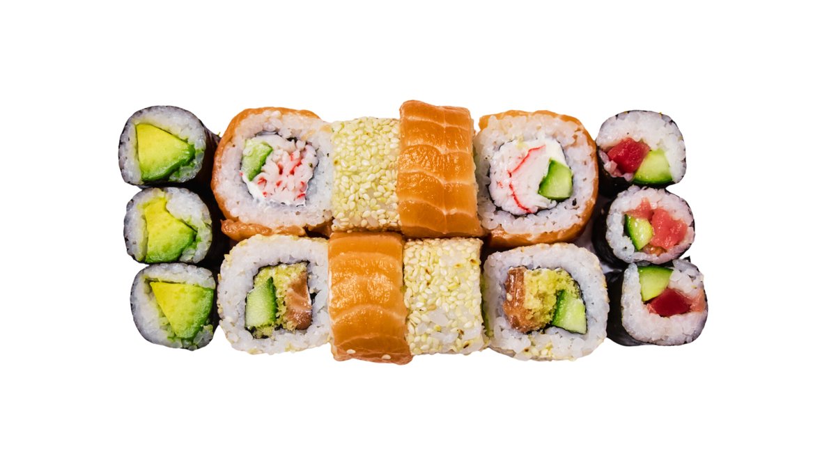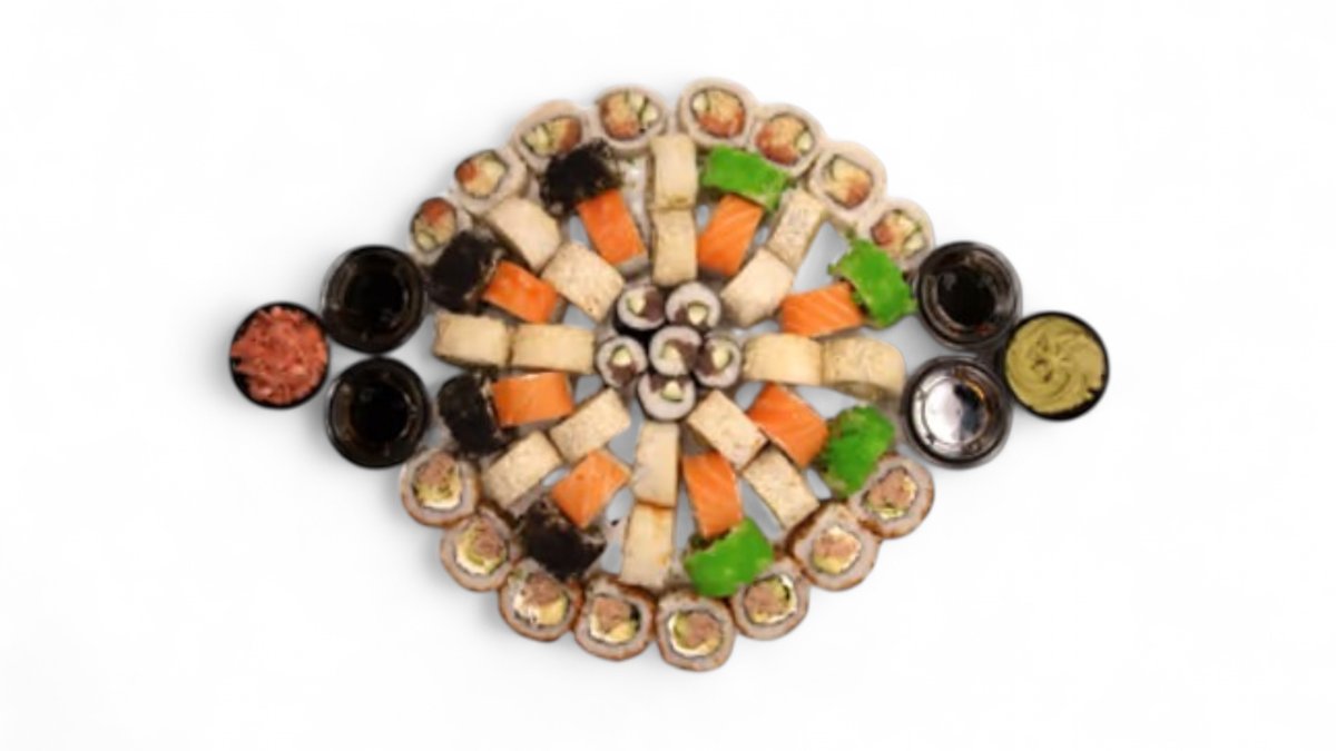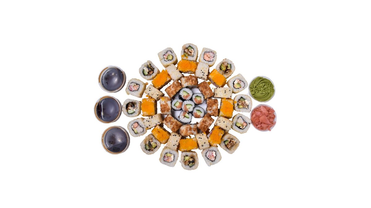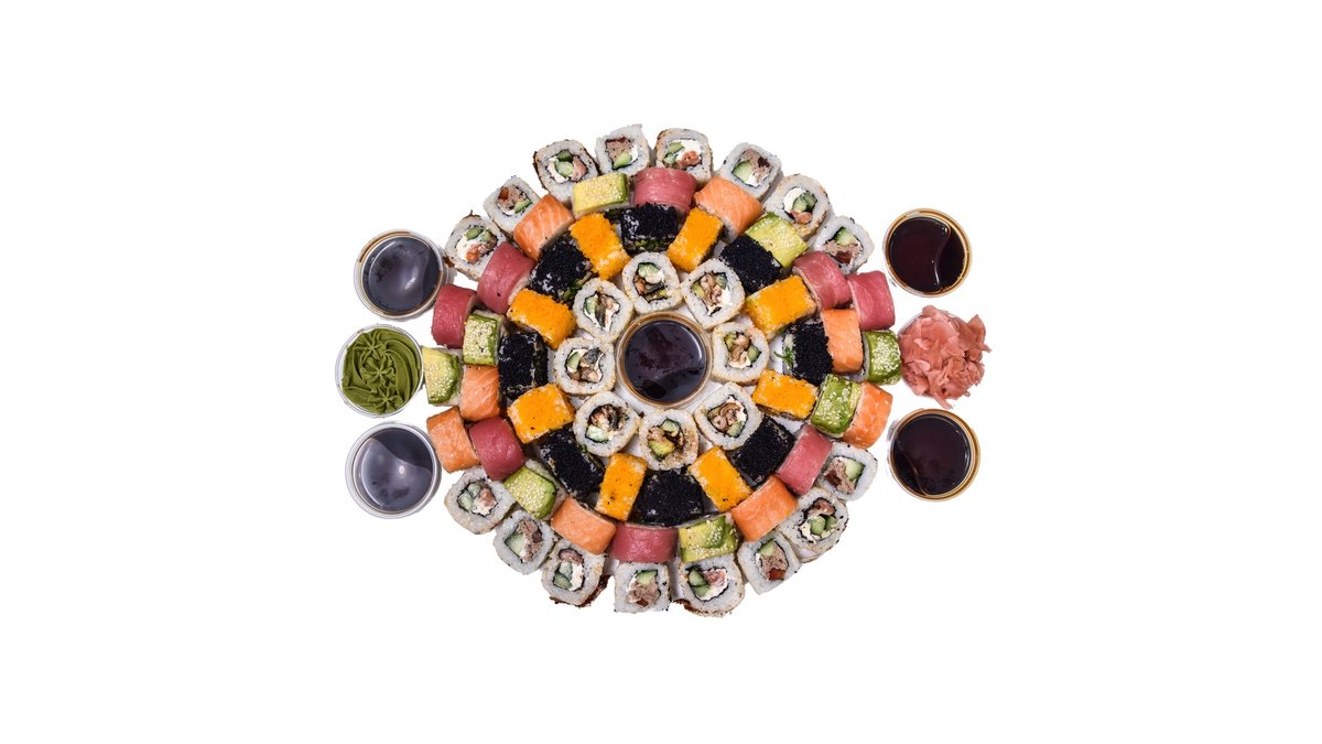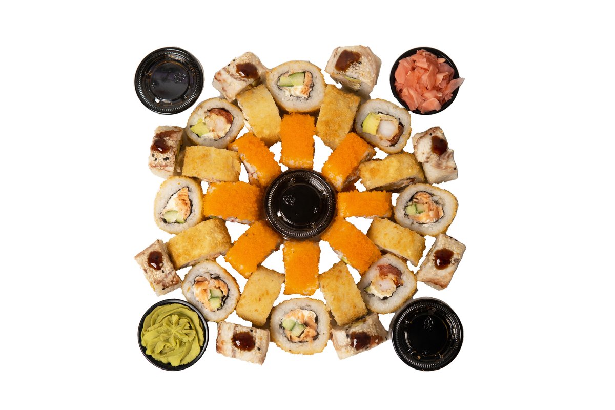 64 vienetai 8-9 asmenims. Nr. 11 Kani masago 8 vnt. Nr. 16 Ebi sake 8 vnt. Nr. 17 Sake avocado 8 vnt. Nr. 23 Sezamo maguro 8 vnt. Nr. 26 Ebi maguro 8 vnt. Nr. 28 Ebi masago 8 vnt. Nr. 31 Unagi sezamo 8 vnt. Nr. 33 Unagi sake 8 vnt.