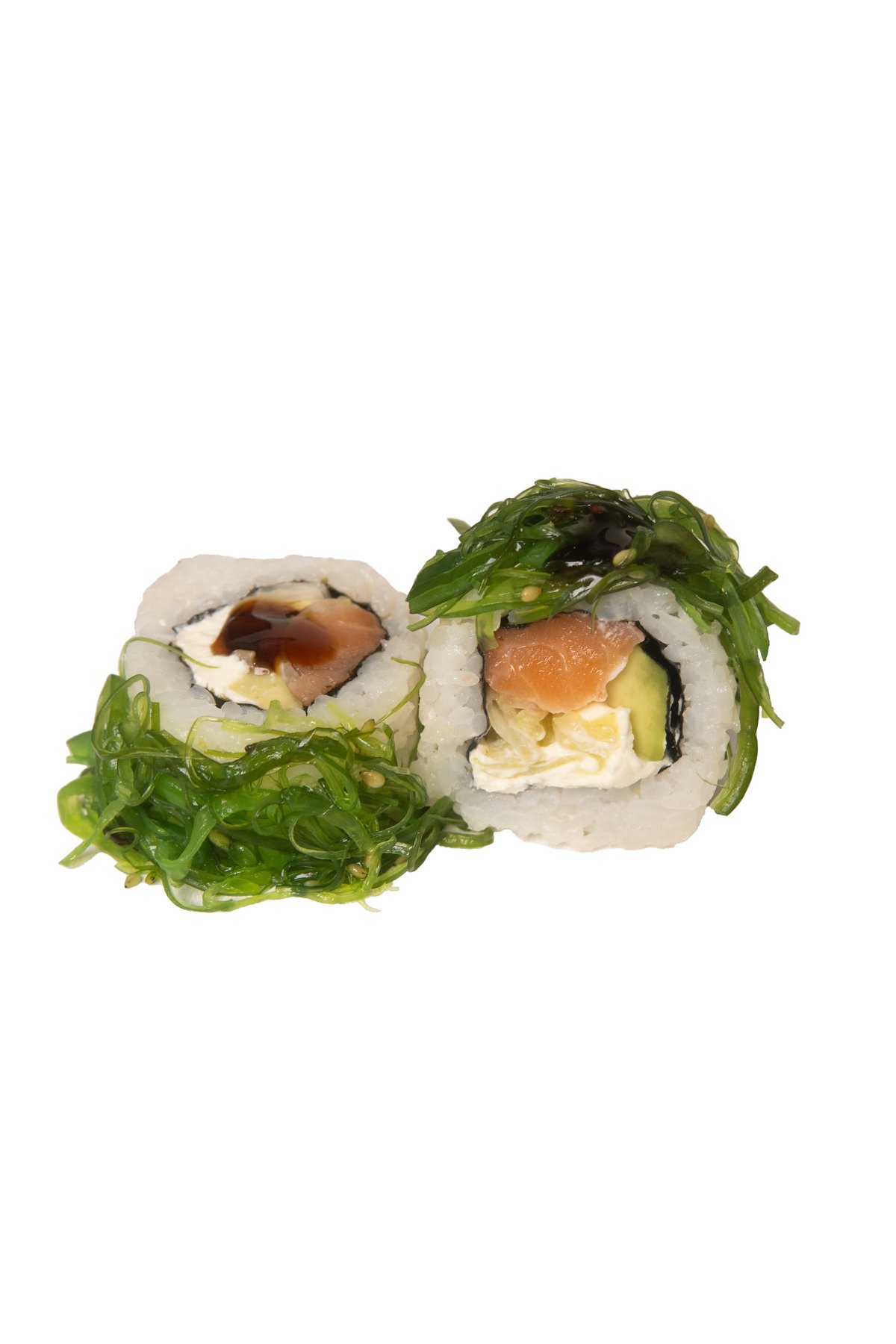 Lašiša, avokadas, salota, kremas, wakame salotos, teriyaki padažas
