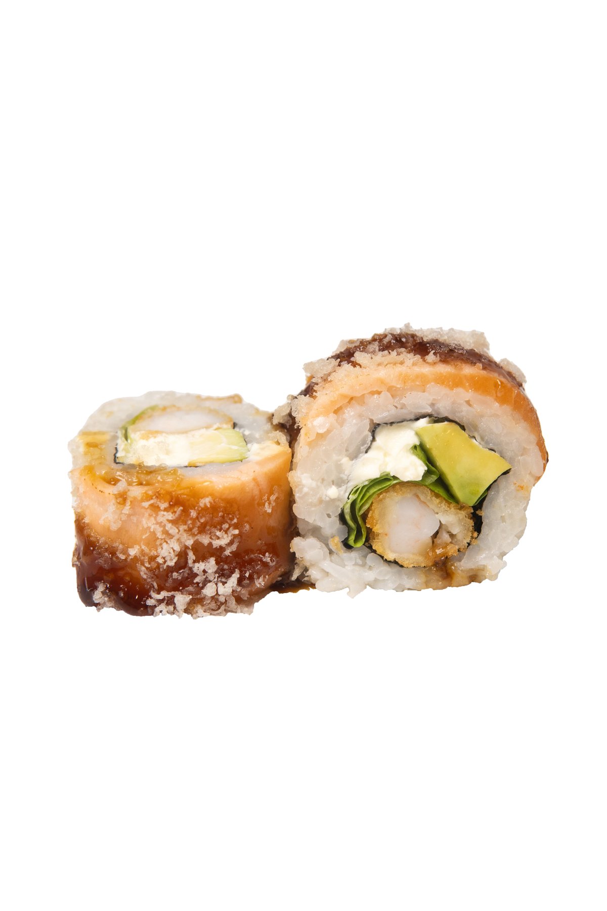 Deginta lašiša, kepta tigrinė krevetė avokadas, salota, kremas, teriyaki padažas, tempura traškučiai