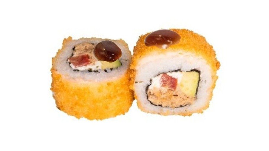 Keptas tunas, agurkas, paprika, kremas, karai padažas, tempura tešla, panko džiuvesėliai