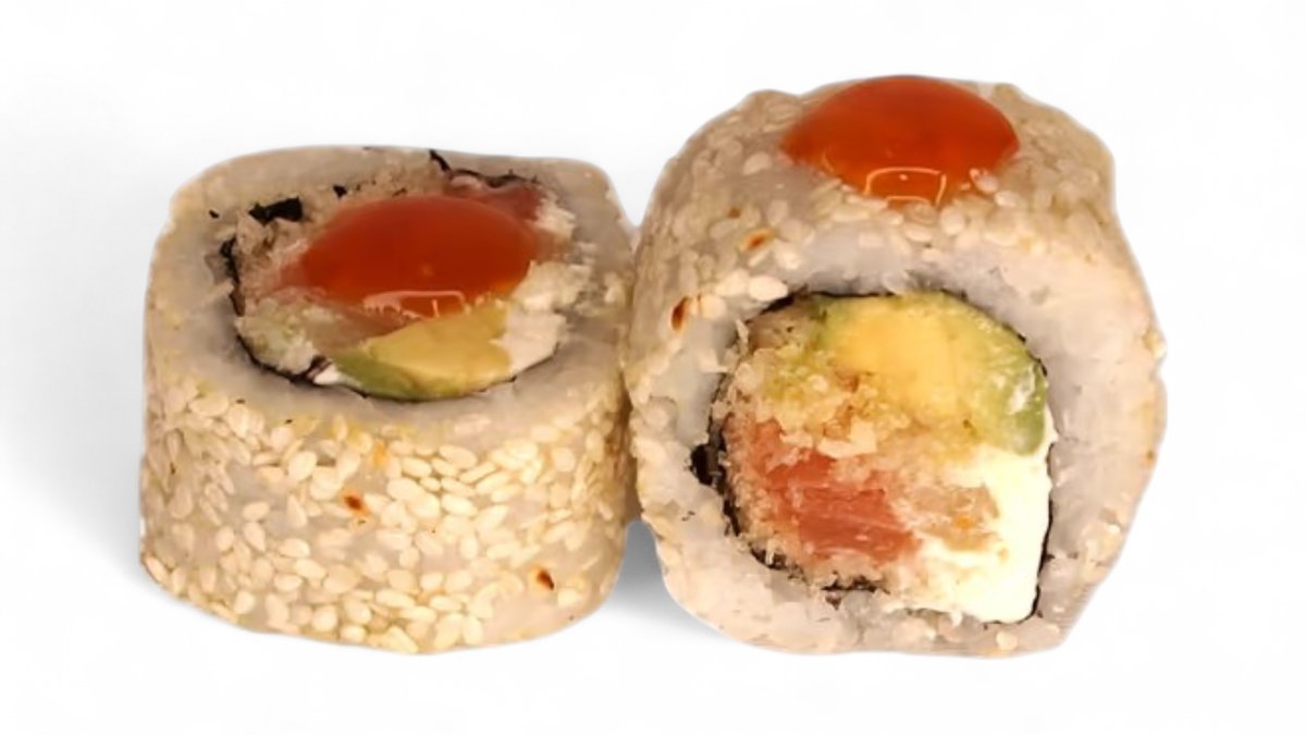 Rūkyta lašiša, oranžiniai ikrai, avokadas, kremas, tempura traškučiai, sezamas