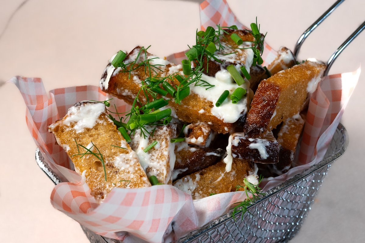 Falafeliai, kepti pievagrybiai ,kepti svogūnai, chederio sūris, česnakinis padažas