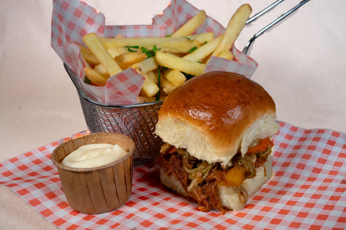 Brioche bandelė, plėšyta kiauliena, coleslaw BBQ padažas
