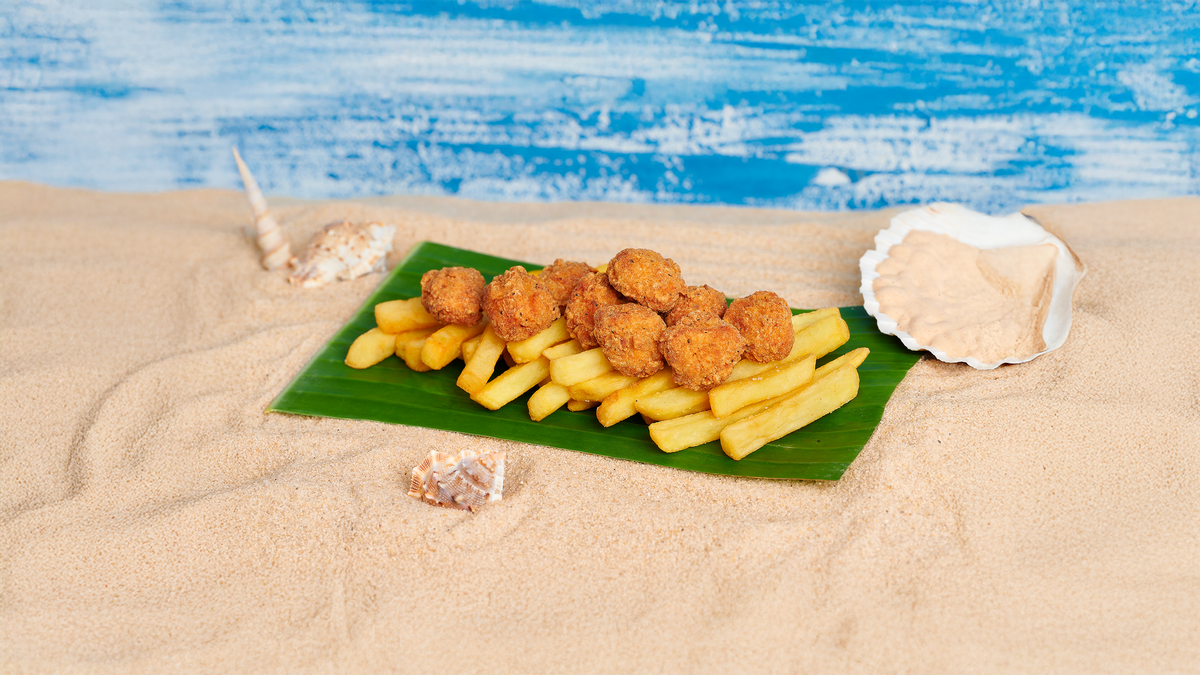 Menkės file alaus tešloje, belgiškos bulvytės, padažas. Patiekiama su citrinos skiltele Menkės filė gabalėlių skaičius gali skirtis dėl natūraliai skirtingų dydžių. Mažoje porcijoje 150 g. menkės filė, didelėje 200 g.