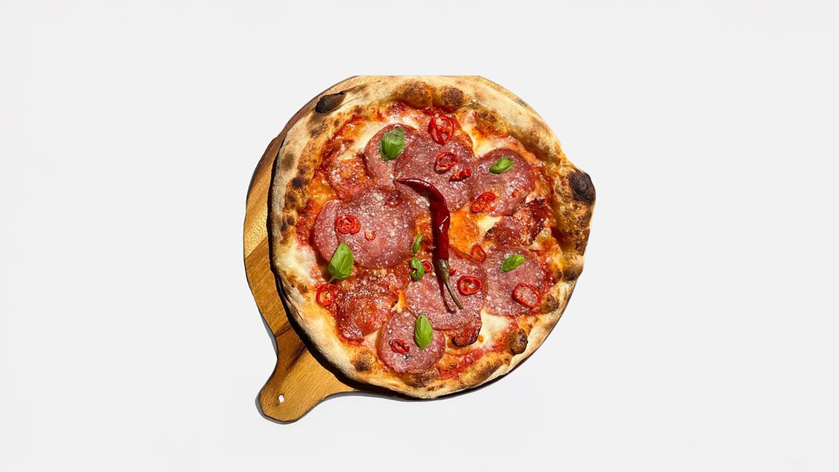 Pomidorų padažas, mozarela, salami Napoli, salami Milano, salami Spinacho Picante, šviežias čili, marinuotas čili