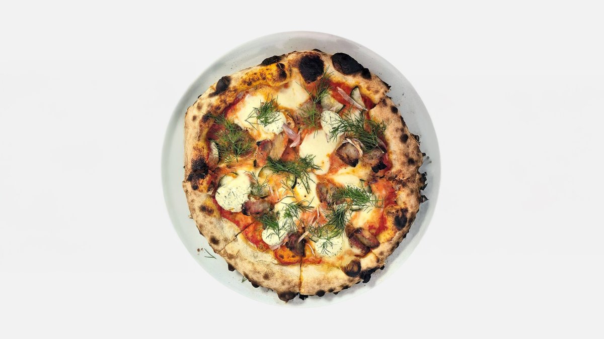 Pomidorų padažas, mocarela sūris, kiaulienos šašlykas, marinuotas agurkas, šalotiniai svogūnai, jogurtinis-krapų padažas