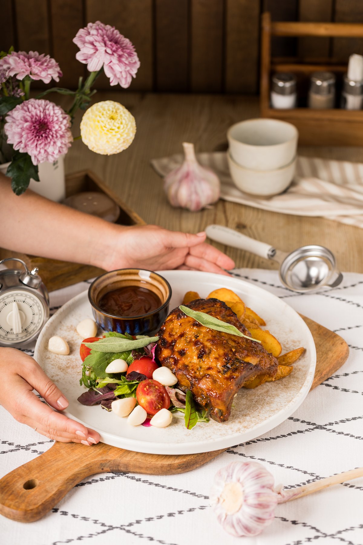 Šonkauliukai, keptos bulvių skiltelės, žalios salotos, pomidorai, BBQ padažas