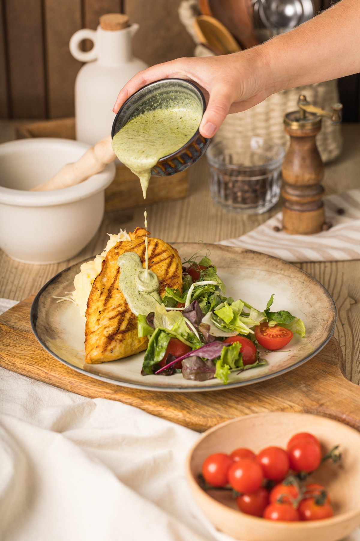 Vištienos filė, naminis bazilikų - grietinėlės padažas, bulvių košė, žalios salotos, pomidorai