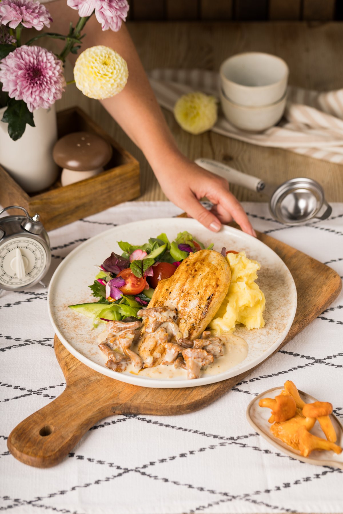 Vištienos filė, voveraičių - grietinėlės padažas, bulvių košė, žalios salotos