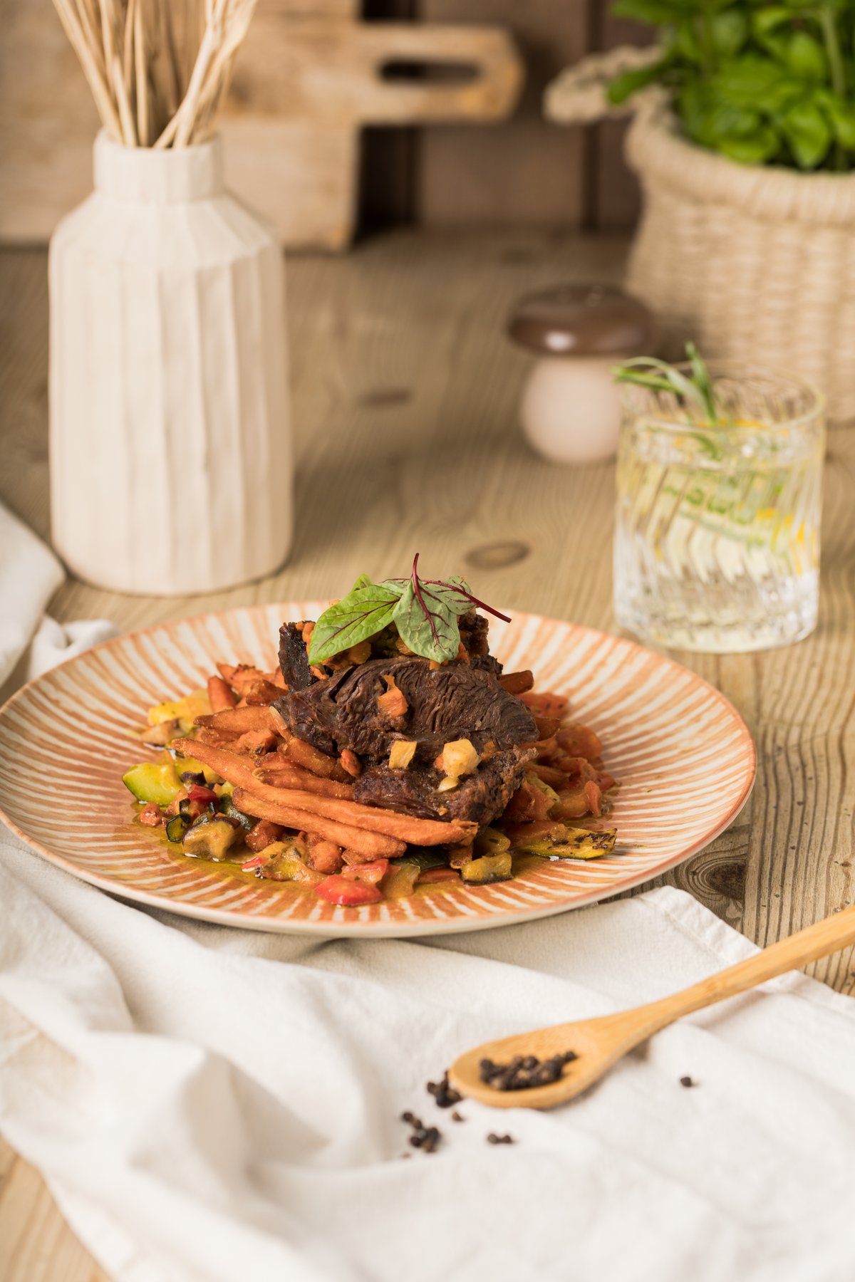 Sprandinė, gruzdintos bulvytės, griliuotos karštos daržovės, baravykų padažas