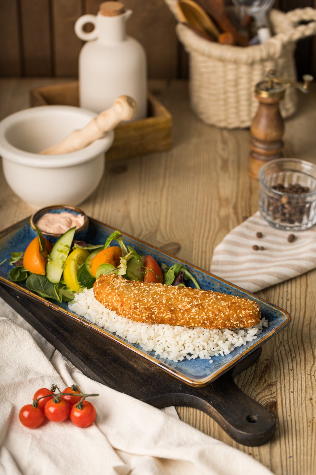 Menkės filė, ryžiai, pikantiškas majonezo padažas, žalios salotos, sezamas