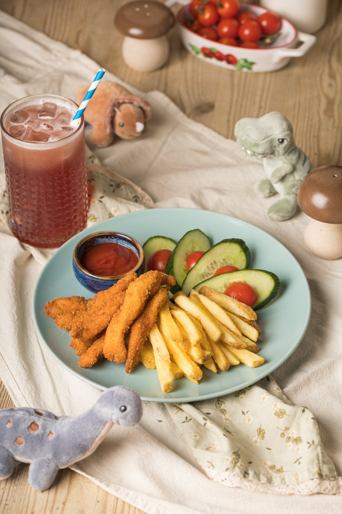 Dešrelės, gruzdintos bulvytės, pomidoras, agurkas, kečupas