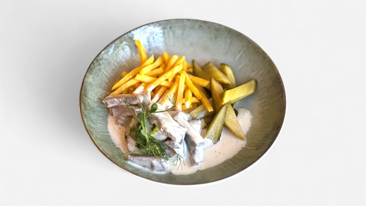 Jautienos liežuvis, grietinėlė, krienai, gruzdintos bulvytės, marinuoti agurkai