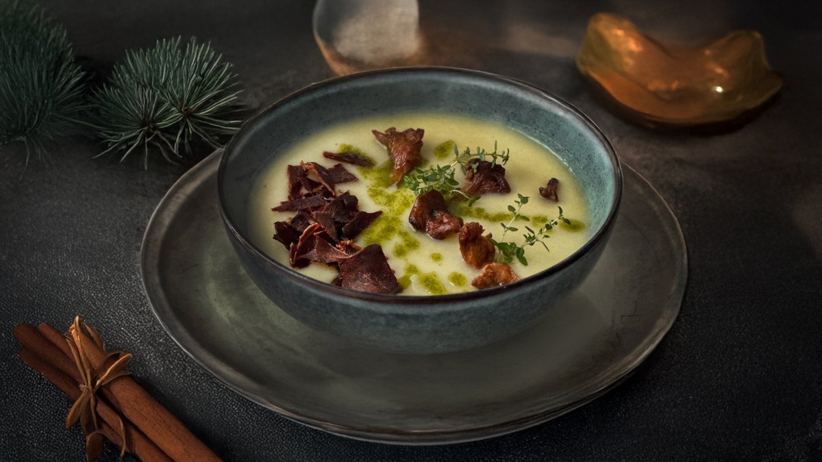 Kreminė bulvių sriuba su voveraitėmis ir kumpio traškučiais