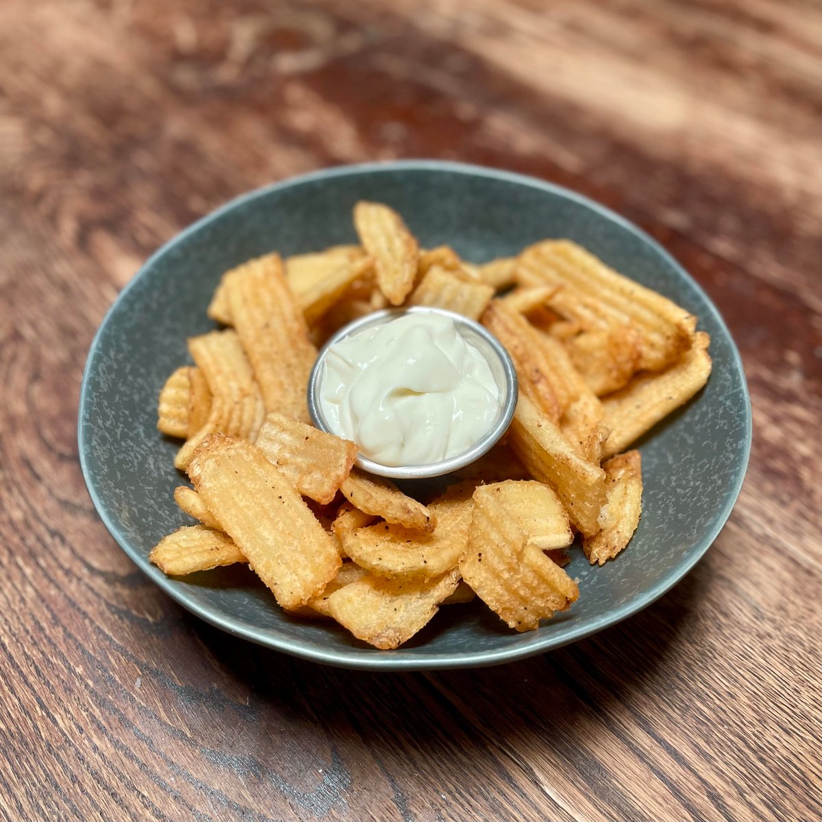Patiekiama su bulvytėmis fri, šviežių daržovių salotomis ir pelėsinio sūrio padažu