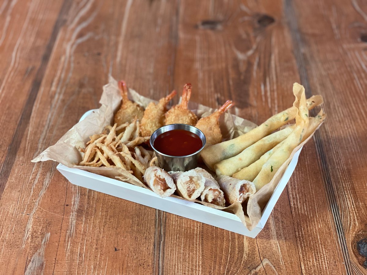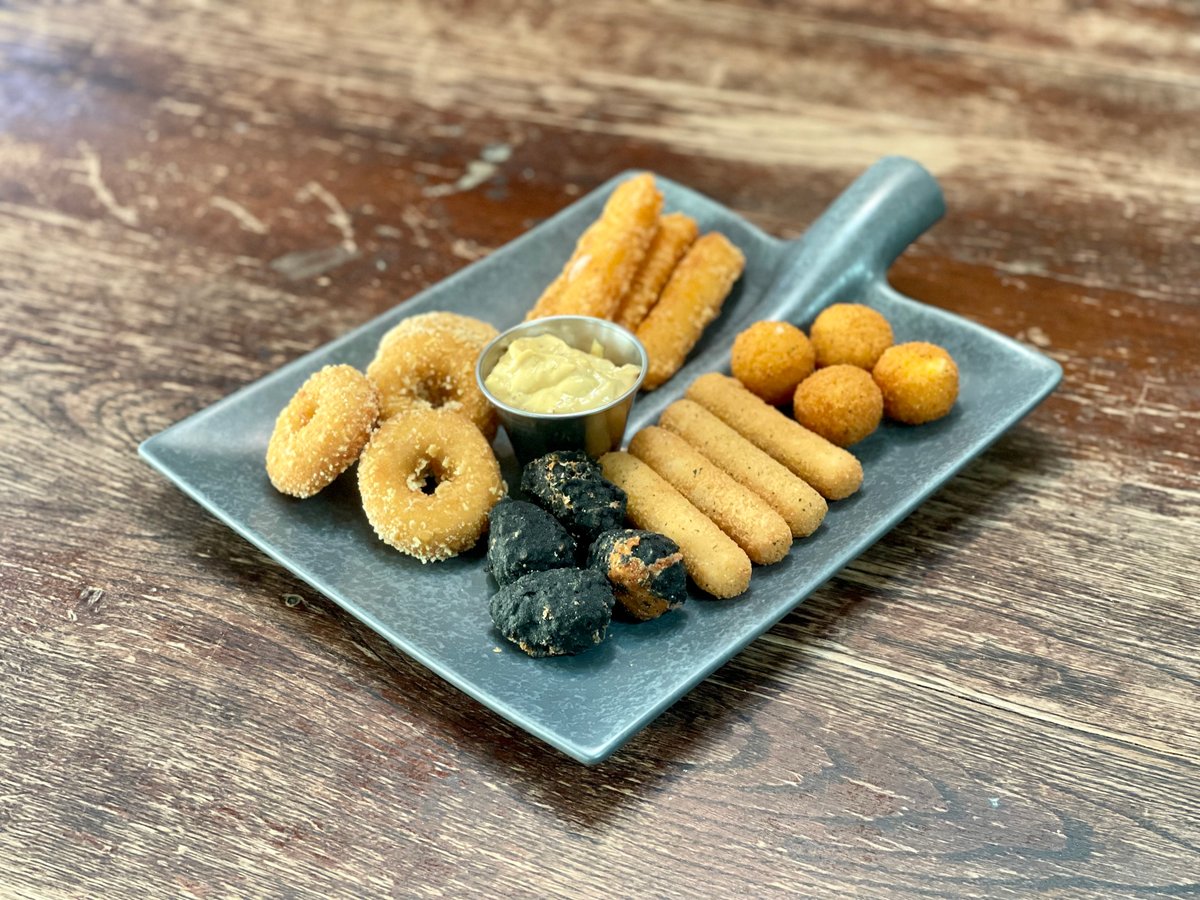 Mocarela sūrio spurgytės su jelapenais, kalmarų žiedai, spring rolls'ai, svogūnų žiedai, saldžiosios bulvytės, bulvių traškučiai. Padažai: kečiupas, saldžiarūgštis bei rančo.