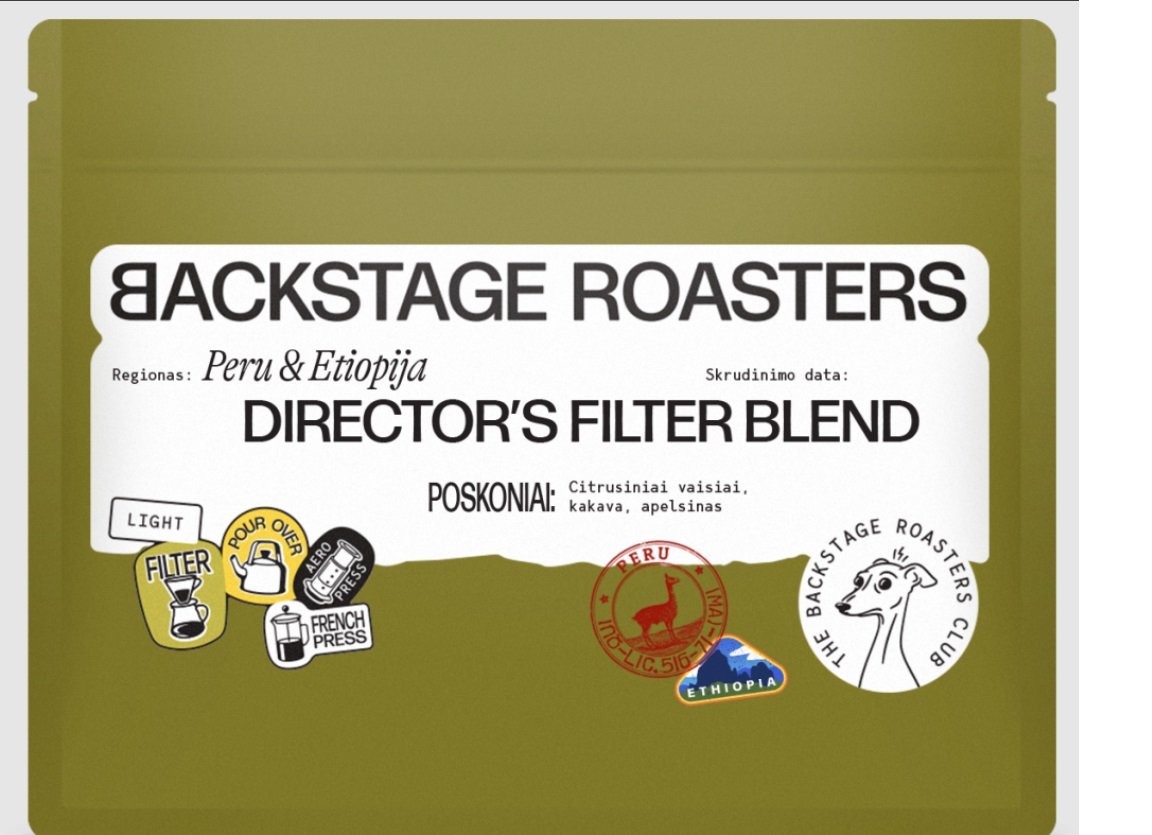 Director’s Cut Blend – tai šviesaus skrudinimo kava, kurioje susitinka Afrikos ir Pietų Amerikos poskoniai ant gomurio palikdami malonų saldumą. Prieš pasineriant į kavos pasaulį, Vytenis, Robertas ir Ieva, Backstage įkūrėjai, dirbo fotografijos ir kino indsutrijoje. Dabartinės Naujamiesčio kavinės patalpos buvo namai, kuriuose sutilpo ir miegamasis, ir laukiamsis, ir netgi fotostudija su užkulisiais. Nors dabar apie tai, kad čia kažkas gyveno byloja tik prisiminimai, daugybė dalykų liko nepakitę – virtuvė vis dar toje pačioje vietoje, tik dabar vadinama kavos baru; palečių staliukas ir sofa taip nepajudėjo, tik šiandien čia sėdintieji laukia nebe fotosesijos, o kavos puodelio. Buvusi studijos erdvė nusidažė juodai, prisipildė stalais, prie kurių ir šiandien dažnai sutikstime tuos, kurie kadaise čia fotografavosi. Director’s Cut – filmo versija, atspindinti režisieriaus pradinę viziją, kuri gali skirtis nuo tos, kurią mato žiūrovai. Ši kava tai odė mūsų praeičiai, darbams ir akimirkai, kai iš gerai pažįstamų užkulisių nutarėme žengti ten, kur prieš tai buvome tik svečiai.