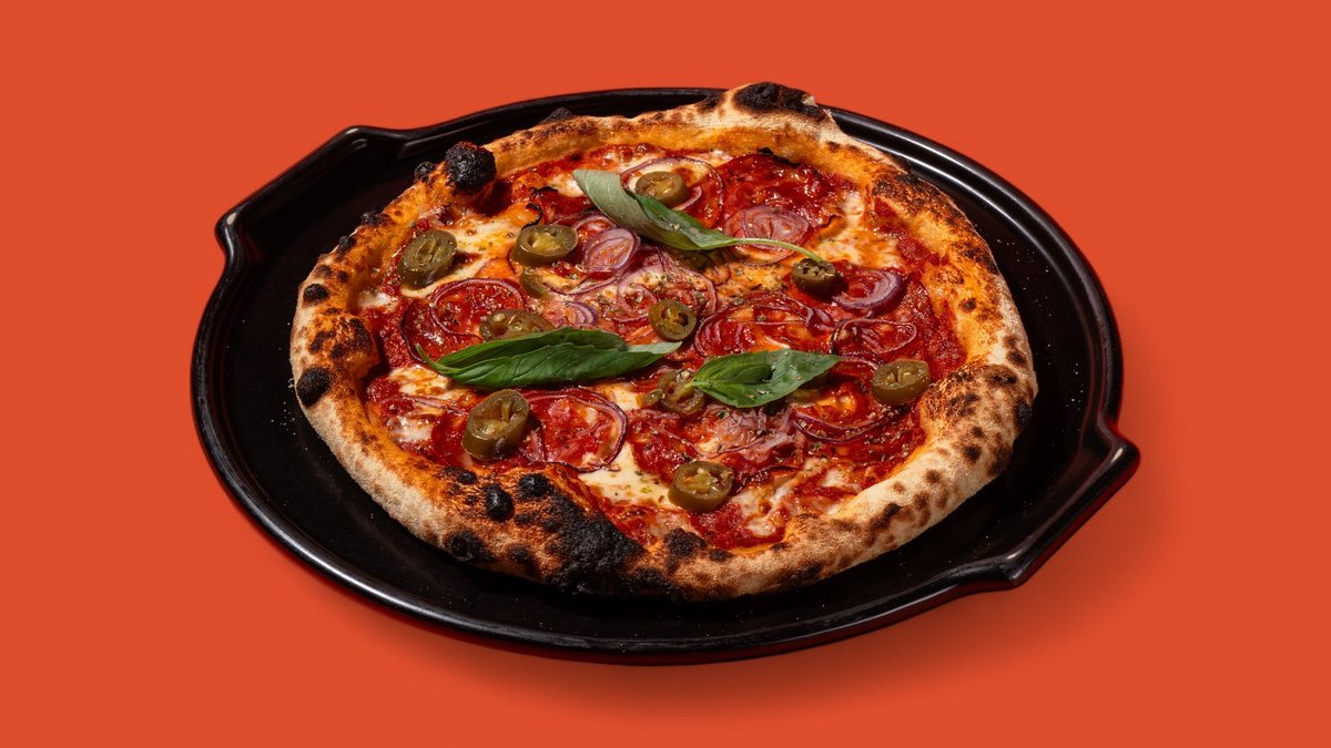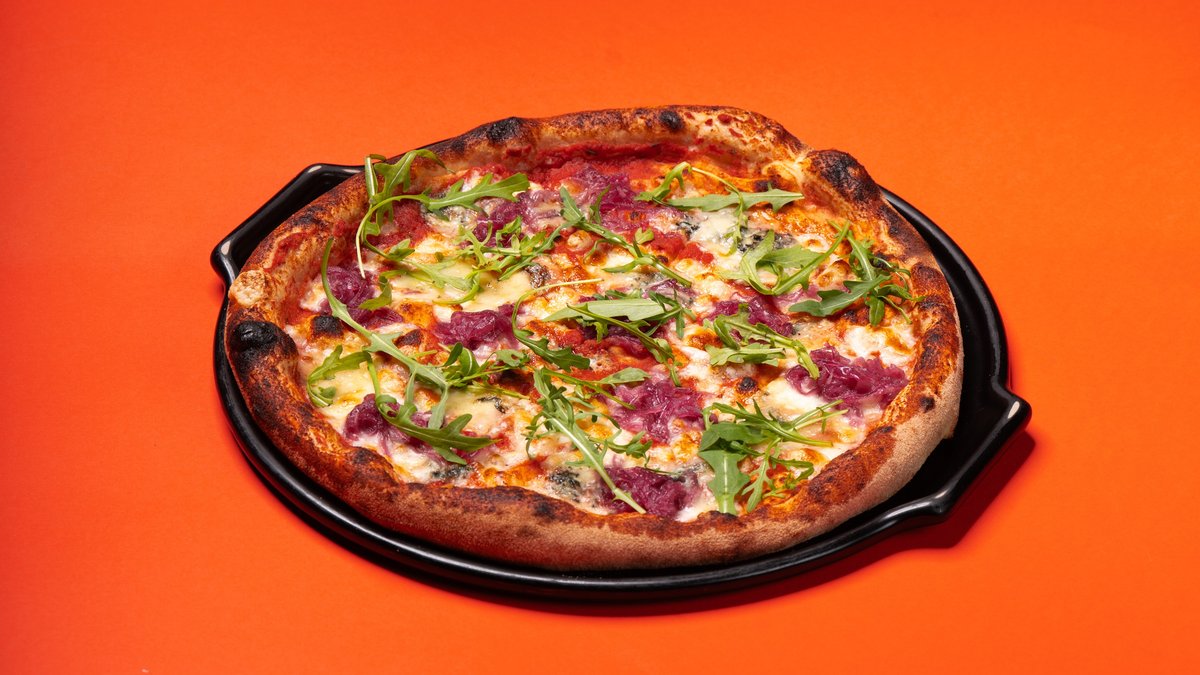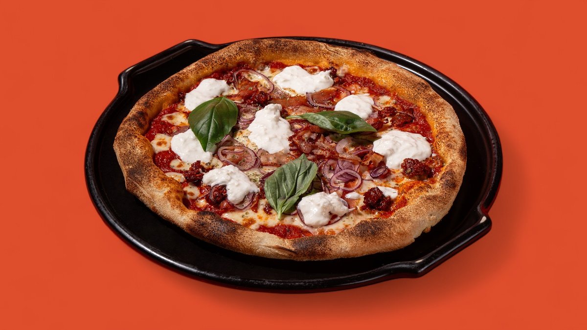 Trintų pomidorų padažas, mozzarella, nduja, šoninė pancetta affumicata, stracciatella sūris, raudonas svogūnas, gražgarstės